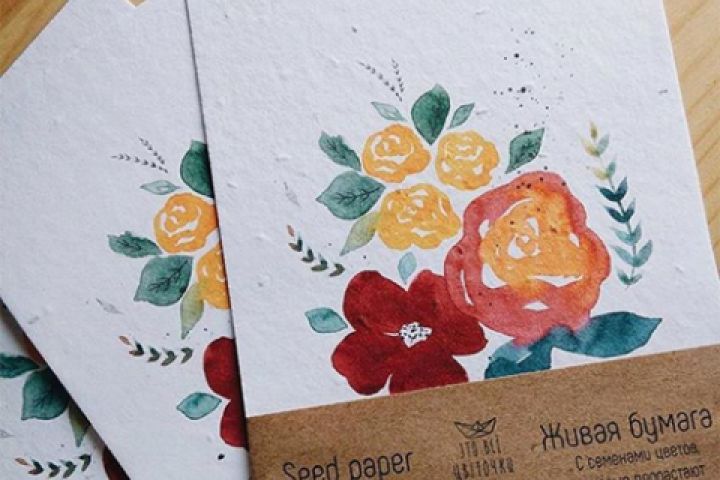 Работа Акварельные цветы, напечатана на фактурной бумаге с семенами полевых цветов. Размер 148х105 мм. Принт создан в коллаборации с etovsecvetochki.ru