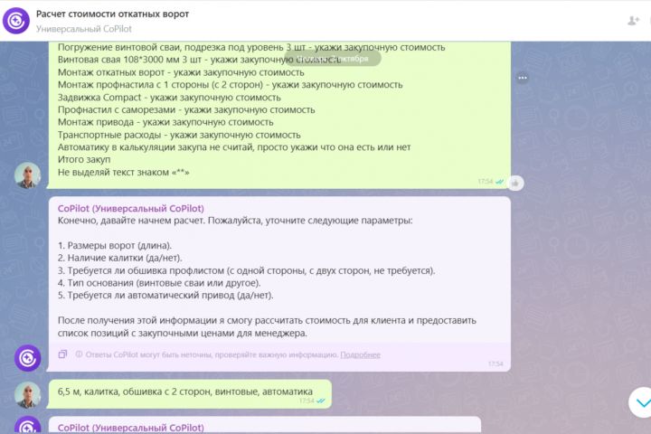 ИИ запрашивает ключевые параметры заказа (например, размеры ворот, тип материала).