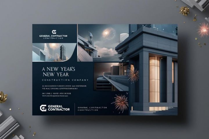 дизайн открыток от строительной компании генподрядчика для поздравления компаний партнеров к новому году. Дизайн лаконичный, строгий, но отображающий суть компании и атмосферу Нового года