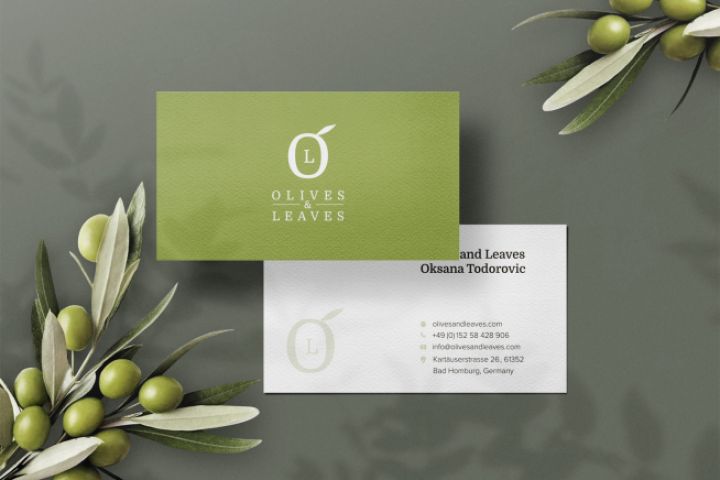 Визитная карточка превратилась в манифест бренда, который можно подержать в руках. Контраст фактур (насыщенный цвет vs. чистая белизна) и деталей (четкий текст vs. полупрозрачный логотип) создает запоминающийся тактильный и визуальный опыт. Такой дизайн не теряется в стопке других карточек и работает как молчаливый, но убедительный продавец, транслируя ценности «Olives & Leaves» через каждую деталь.