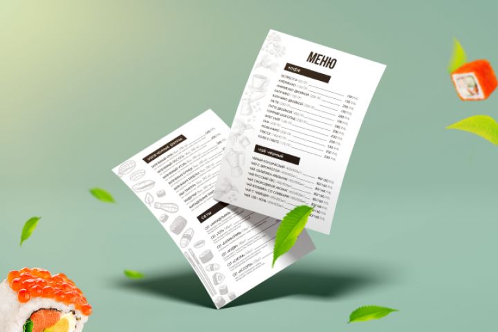 Дизайн меню в черно-белом минималистичном стиле с небольшим паттерном сбоку