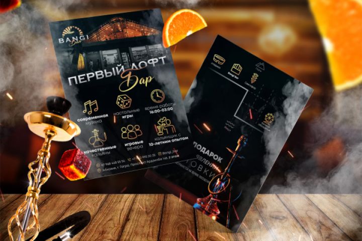 Создание логотипа, листовок, визиток, баннера, меню для нового lounge бара "Bangi Bar"