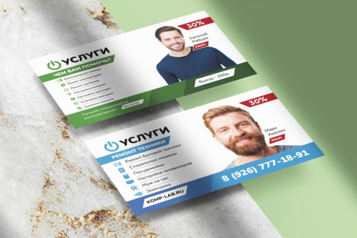 Двусторонняя визитная карточка для компании, оказывающей большой список услуг. К каждой услуге подобрана соответствующая иконка.