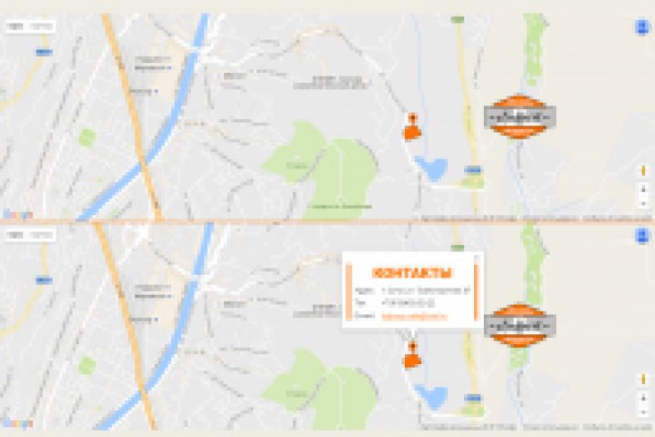 Модальное окно на Google карте. Реализовано через API. Весь код реализации представлен на картинке. Само окно является частью карты и привязано к гео координатам.