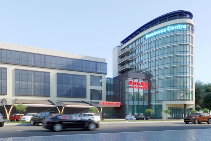 Проектом предполагается пристройка к зданию торгового дома "Парк сити". Первые три этажа - ресторан, следующие пять этажей - офисы, верхний этаж - технический. Так же предполагается подземный гараж-стоянка.