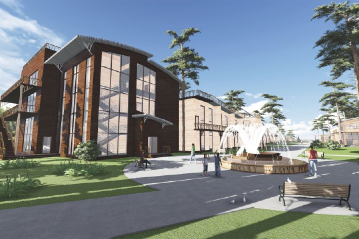 Жилая зона, расположенная на нижнем плато, рассчитана на двести человек и включает в себя: частные дома разной вместимости и конфигурации, продуктово-хозяйственный магазин с аптечным пунктом и гостиницей на втором этаже, а также