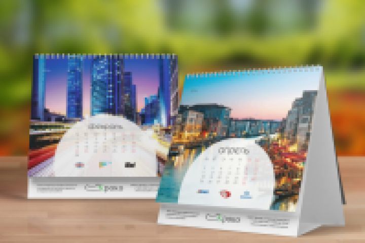 Календарь домик, основа картон 300 гр, с запечаткой 4+0, 3 бига, брошюровка блока с основой на пружину (белого цвета), блок 12 полос, 4+4 (6 листов в календарном блоке) на бумаге 130 гр.
