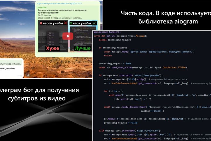 Бот написан на языке программирования Python, с использованием асинхронной библиотеки aiogram. Боту можно скинуть видео из ютуба и вы получите текстовый документ с субтитрами из этого видео