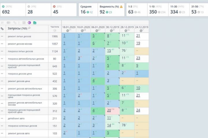 Продвижение сайта по ремонту и покраске литых дисков с нуля. Регион - Москва. За 3 недели с 24 декабря по 18 декабря в топ-10 вышло 234 запроса.