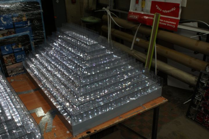 Это несколько сотен (не помню точно, но больше 500 точно) стаканчиков квадратного сечения, в которые ставятся всякие карандаши-ручки. По основанию размер 1000х1500 мм. Некоторая трудность состояла в том, что соседние стаканчики должны иметь общую стенку, т. е в один слой материала, при этом конструкция должна быть сборно-разборной.
