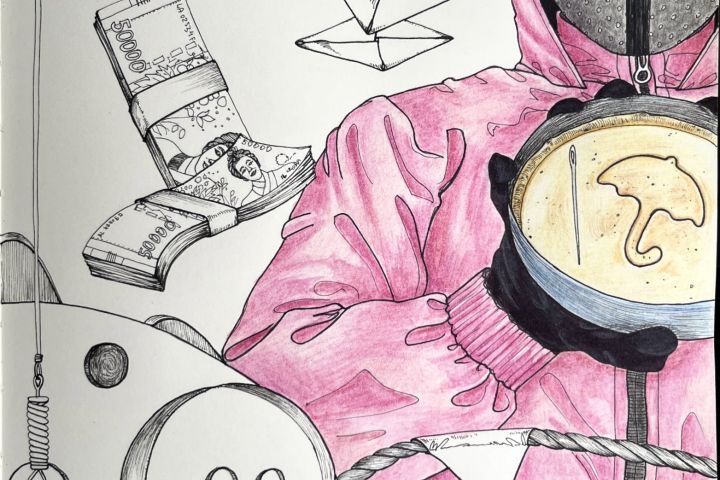Нарисовано на бумаге (акварельные карандаши, чернила)
