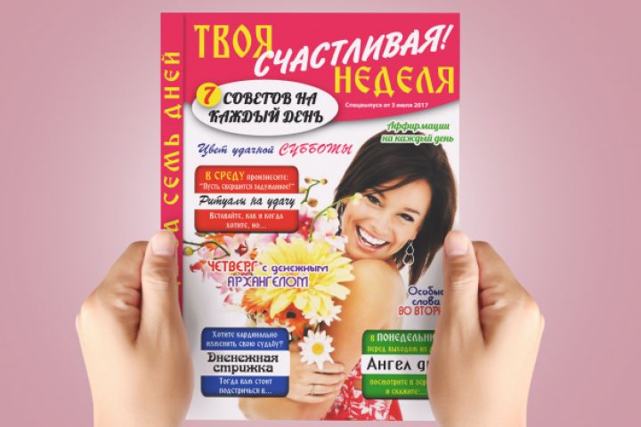 Журнал «Твоя счастливая неделя" Задумка заказчика: Счастливая девушка + анонсы. Цветовая гамма: Выполнена по желанию заказчика. Формат журнала: А5