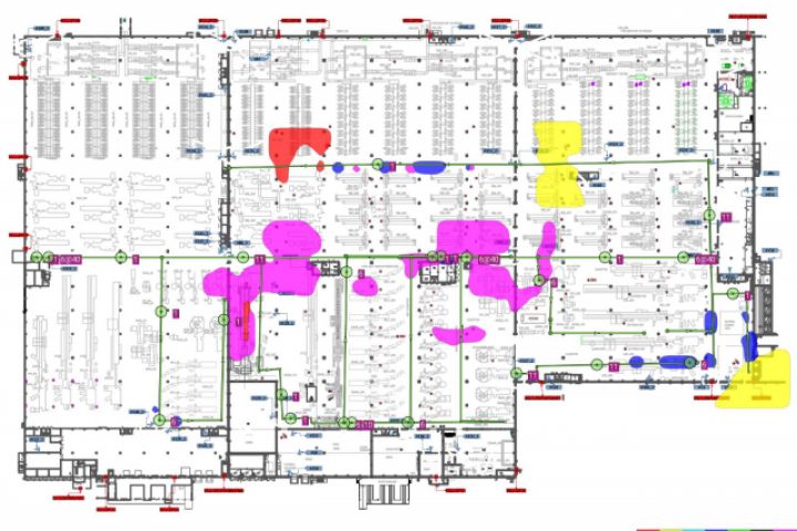 На рисунке зелеными элементами отображены маршруты проведения радиообследования и выявленные места установки существующих точек доступа. Красная зона указывает на недостаточный уровень сигнала, желтые зоны - на недостаточное перекрытие сигналов от разных точек доступа для бесшовного роуминга, синие зоны - низкий уровень соотношения сигнал/шум, фиолетовые зоны - зоны с высоким уровнем соканальных помех.