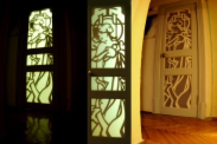 дверь в ванную комнату витраж вырезан из массива двери, обклеен, вырезанным по контору массива, пенокартоном и закрыт матовым оргстеклом