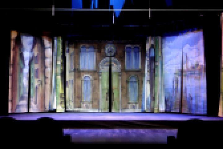 Декорации к спектаклю " Слуга двух господ " реставрация: восстановление цвета, коррекция фрагментов (персонажей, мебели, зданий) , а так же создания объёма с помощью аэрографа.