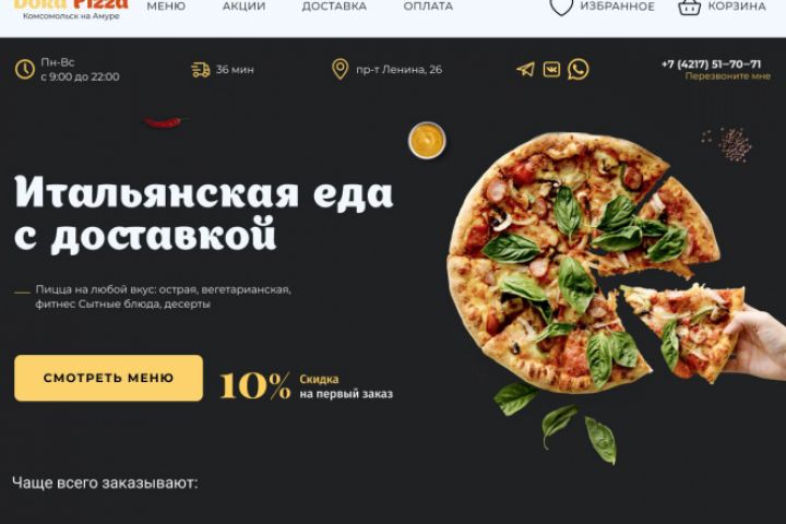 Редизайн сайта местной пиццерии г. Комсомольска на Амуре "Дока Пицца", мобильную версию сайта, дизайн приложения