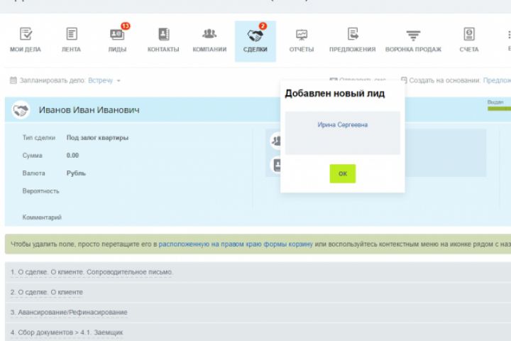 Появление диалогового окна при создании лида.