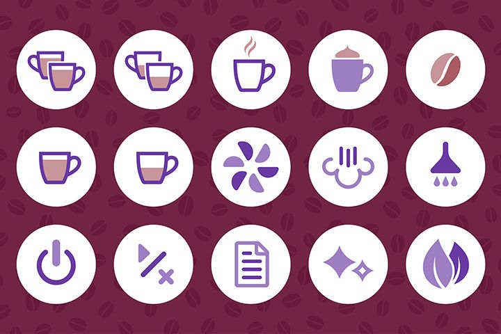 Набор пиктограмм в векторном формате для интерфейса контрольной панели кофе-машины в стилистике инфо-графики. Пиктограммы я создал для 3D-модели кофе-машины, ссылка на которую доступна ниже. Используемая программа: Xara Photo & Graphic Designer.