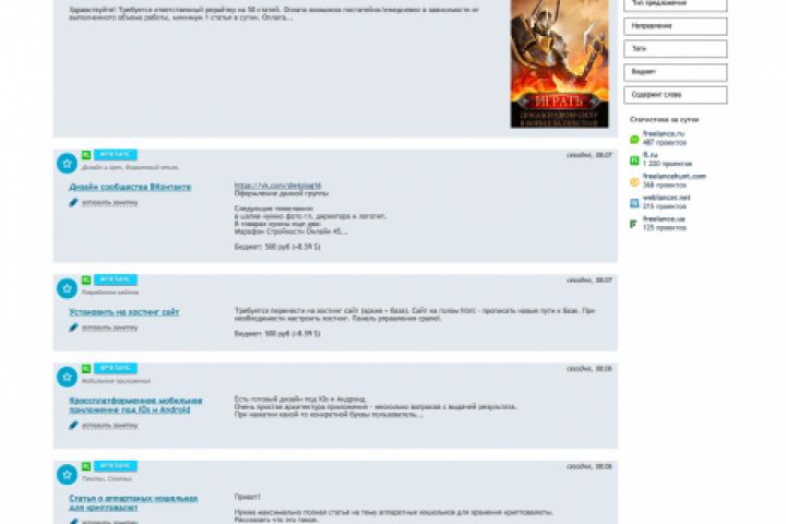 На сайте в реальном времени публикуются проекты, вакансии, конкурсы из таких популярных фриланс-бирж, как fl.ru, freelance.ru, freelancehunt.com, weblancer.net.