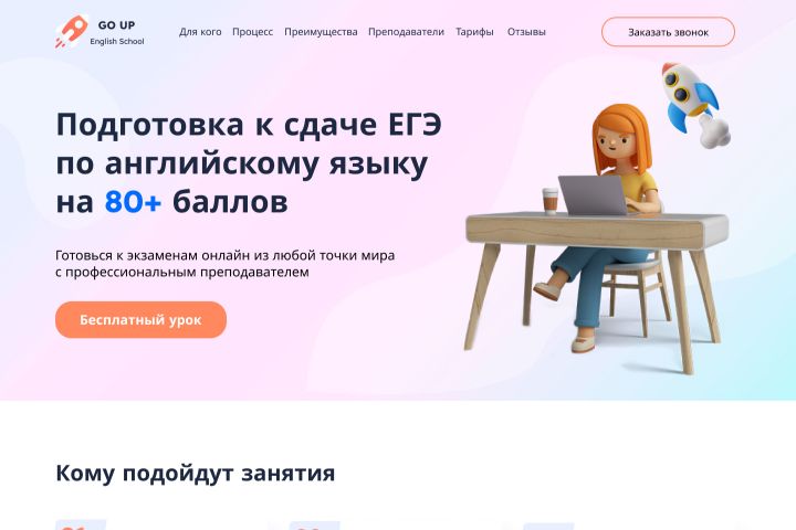 Разработка лендинга для подготовки к сдаче экзаменов. Индивидуальный дизайн, верстка, наполнение. Настройка контекстной рекламы