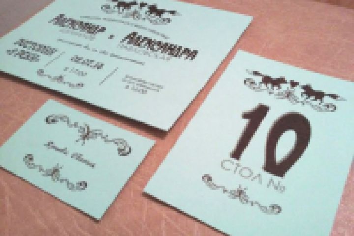 Свадебная полиграфия с влюбленными лисами на дизайнерской бумаге мятного цвета