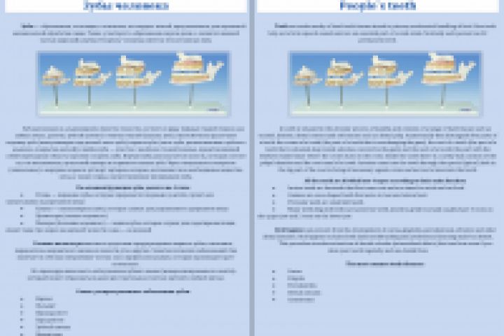 Перевод с русского языка на английский стоматологической статьи "Зубы человека", в которой описывается строение зубов, типы зубов и их функции, а также говориться о гигиене полости рта и наиболее распространенных зубных заболеваниях.