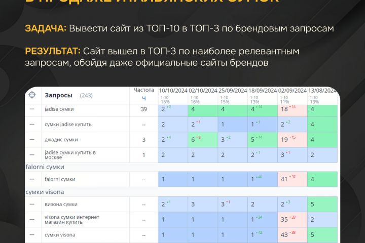 Результат: сайт вышел в ТОП-3 по наиболее релевантным запросам, обойдя даже официальные сайты брендов