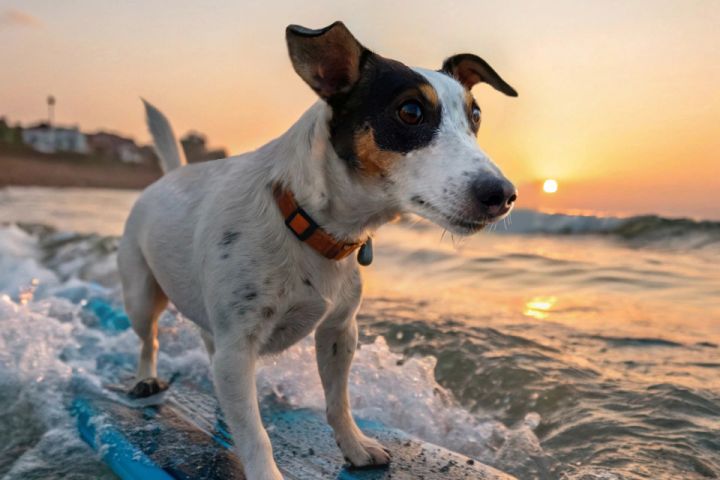 Собака породы Джек Рассел терьер едет на серфинге по волнам на море, закат.