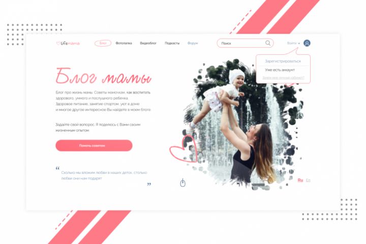 В дизайне была задача сделать сайт легким, нежным. Для этого подбирались подходящие цвета, типографика удобная и приятная в прочтении текстов. Рукописный шрифт в заголовках, ведь это блог. Легкий минимализм, чтобы читателям было удобно читать тексты, ни на что не отвлекаясь. Концепция исходит из того, что мама пишет статьи от своего сердца, маленькие сердечки подчеркивают концепцию и цвет приятный коралловый.