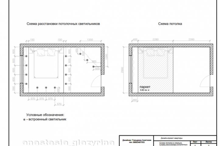 Схема потолка и расположения потолочных светильников в спальне