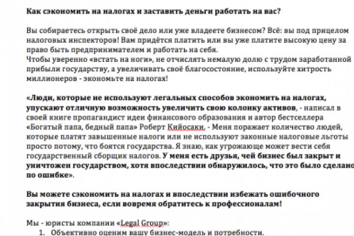 Текст, продающий юридическую услугу по оптимизации налогообложения