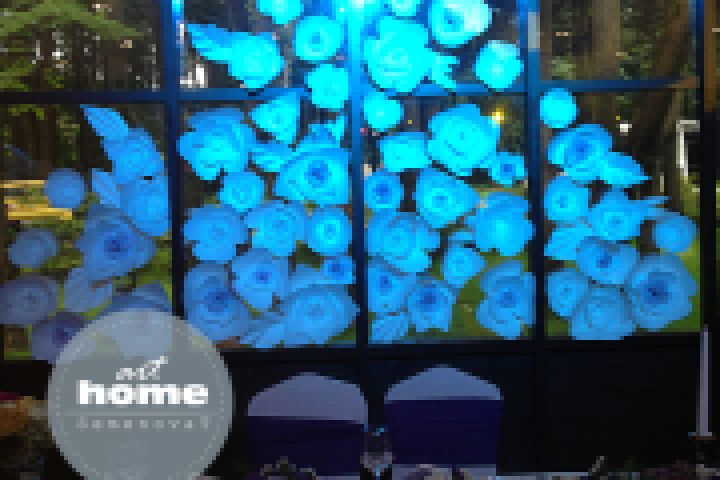 Оформление задника для молодоженов цветами из бумаги. Диамеьр цветов от 25 до 50 см