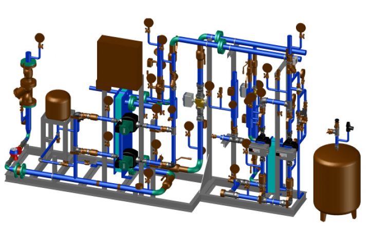Схема присоединения системы отопления - независимая через пластинчатый теплообменник. Схема присоединения системы ГВС - одноступенчатая закрытая. Узел разбирается на транспортабельные блоки.
