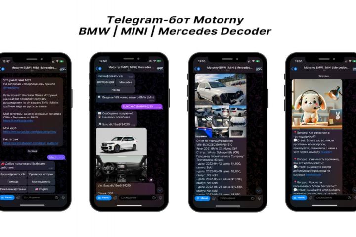 Бот предоставляет возможность расшифровать данные по VIN-коду вашего автомобиля BMW или Mercedes. Проверяет историю автомобиля на аукционах США и Европы. Поддерживает английский и русский языки. Стоимость: 1 500 $