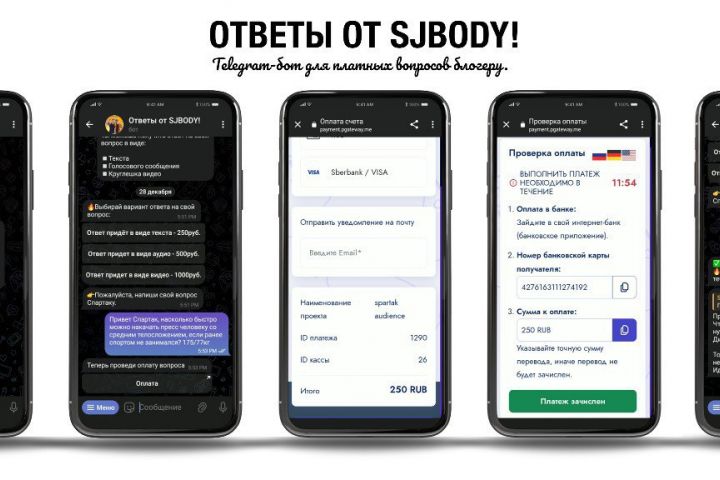 Telegram-бот позволяет отправить платный вопрос лично блогеру, и получить платный ответ в ускоренном режиме в виде текстового, голосового или видеосообщения. Разработан на языке программирования Python Стоимость: 300 $