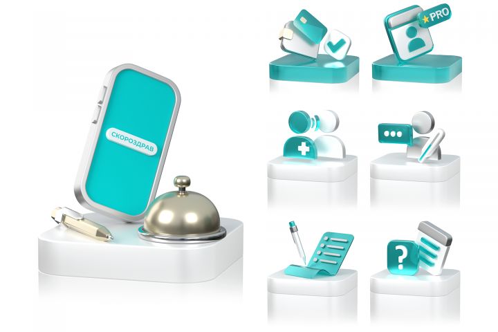 Для сайта и приложения мед-клиники "Скороздрав" была выполнена разработка дизайна иконок и их моделирование в фирменном стиле. Клиентом были предоставлены тематики для иконок: