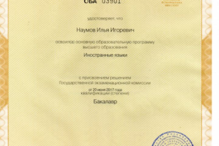 Диплом бакалавра (СПбГУ, Лингвистика. Испанский язык)