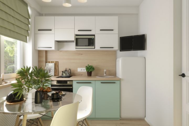 Кухня в теплых оттенках, маленькая светлая, бюджетная.