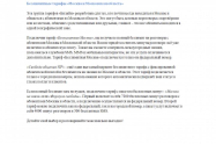 Текст писался для сайта официального дилера "Билайн". Согласно условиям ТЗ, нужно было написать, чем отличаются друг от друга тарифы "Москва и МО", и для кого актуален каждый из них. Тон изложения спокойный, объём текста – 1500-2000 знаков.