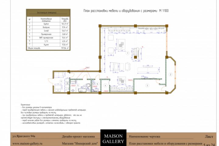 План расстановки мебели и оборудования с размерами магазина «ИМПЕРСКИЙ” для дизайн-студи MAISON GALLERY