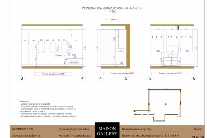 Развертки зоны бутика по осям 3-4, 4-5 и 5-6 магазина «ИМПЕРСКИЙ” для дизайн-студи MAISON GALLERY
