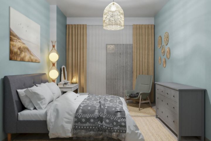 Проект спальной комнаты в мягких тонах, выполнялось моделирование текстиля и осветительных приборов, Corona Renderer
