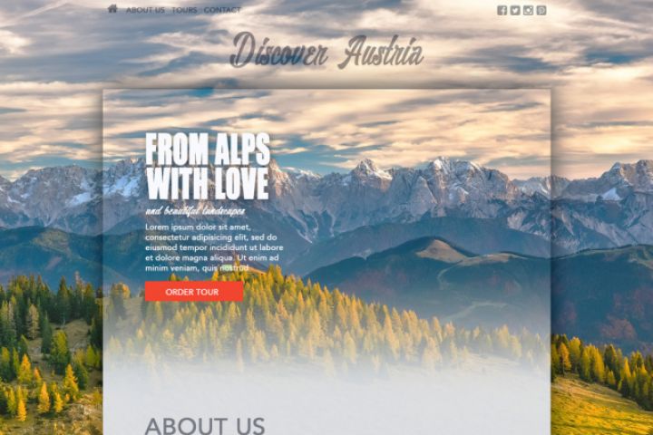 Задача: создать оформление сайта для компании, которая организует туристические экскурсии по горам Австрии, структурировать предложения, разделив их на блоки (по регионам, в которых проводятся экскурсии), сделать акцент на преимуществах (туры для семьи, предоставление шаттлов в аэропорт, завтраков и фотографа).