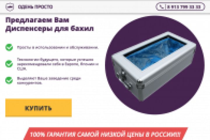 Лендинг пейдж для компании, занимающейся автоматическими диспенсерами для бахил. Сайт "под ключ". Адаптивная версия (ПК, планшет, телефон).