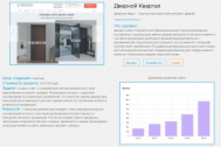 Задачи: Создать сайт с современным легким дизайном в стиле европейских интернет-галерей. Реализовать каталог с удобной сортировкой по различным параметрам, что упростит выбор дверей для пользователя и уменьшит для него время поиска по огромному каталогу уникальной продукции. Результат: Стильный динамичный лендинг с многофункциональной сортировкой каталога. Быстрый удобный фильтр для поиска по большому каталогу продукции. После установки нового дизайна и заполнения подробностей для товаров, увеличилось время, проводимое пользователями на сайте, уменьшен процент отказов.