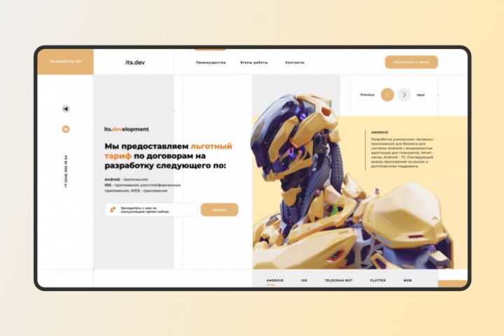 Дизайн сайта its.dev Программы для разработки: Figma, Adobe Photoshop. Выполнялась разработка дизайна. Лендинг.