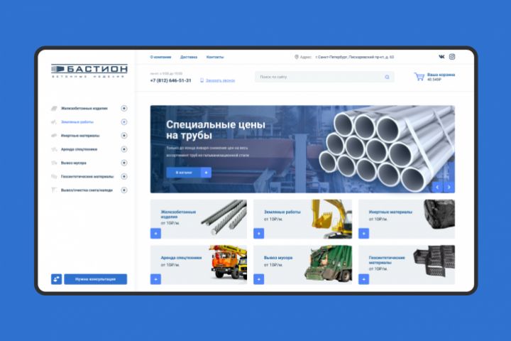 Дизайн сайта Бастион бетонные изделия Программы для разработки: Figma, Adobe Photoshop. Выполнялась разработка дизайна. Многостраничный сайт.