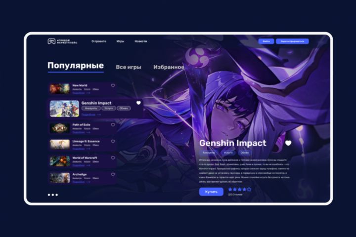 Дизайн игрового маркетплейса Программы для разработки: Figma, Adobe Photoshop. Выполнялась разработка дизайна. Многостраничный сайт.