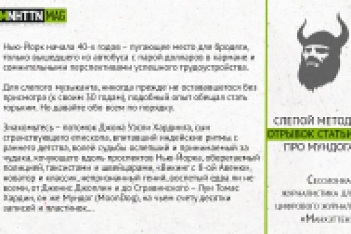 Спецпроект для цифрового журнала "Манхэттен". Статья знакомит читателей с музыкальным новатором и одной из самых противоречивых фигур 20-го века, который был известен под псевдонимом Moondog. Материал основан на "предсмертном" интервью американского композитора