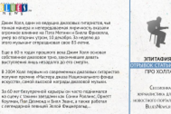 Сессионная журналистика для новостного портала bluesnews.ru — одного из старейших порталов о музыке жанра "блюз". Материал посвящен покойному гитаристу Джиму Холлу